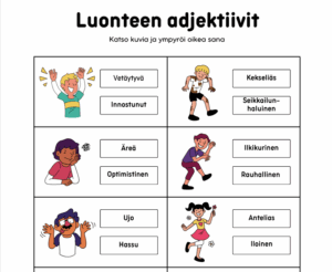 Hauska tehtävä lapsille: Luonteenpiirteitä kuvaavat adjektiivit Tämä luonteenpiirteitä kuvaavia adjektiiveja harjoitteleva kuvatehtävä Luonteen adjektiivit on hauska ja oppimista tukeva lapsille! Lapsen tehtävänä on katsoa kuvaa ja ympyröidä oikea sana kahdesta vaihtoehdosta – kumpi kuvaa kuvan…