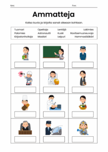 - Sivu 1: 12 ammatin kuvat + apulaatikko, johon lapset yhdistävät oikeat nimet