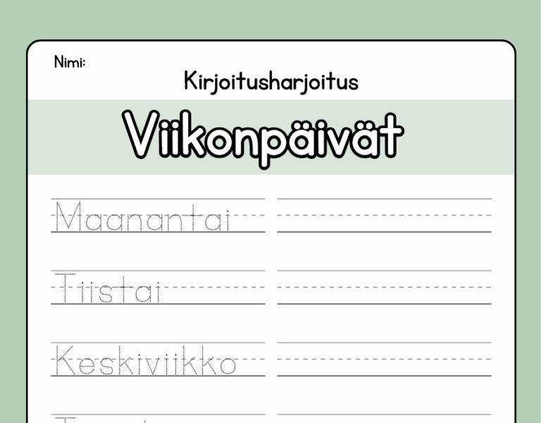Harjoittele viikonpäiviä helposti ja iloisesti! Tämä tulostettava viikonpäivät harjoitus -lomake tekee viikonpäivien opettelusta selkeää ja mielekästä. Sivulla viikonpäivät on kirjoitettu valmiiksi maanantaista sunnuntaihin, ja lapsen tehtävänä on vahvistaa sanat kynällä. Vieressä on viivoitetut rivit, joille viikonpäivät kirjoitetaan ilman mallia – näin oppiminen etenee vaiheittain. Kenelle tämä sopii? Kotiopetuksessa oleville lapsille ja nuorille Alakoululaisille, jotka harjoittelevat…