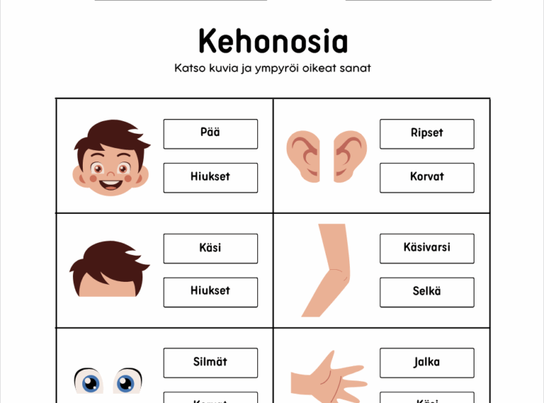 Opi kehonosia hauskojen kuvien avulla! Tässä kaksisivuisessa tehtävässä pääset harjoittelemaan kehonosien nimiä selkeiden ja värikkäiden kuvien avulla. Jokaisen kuvan vieressä on kaksi vaihtoehtoa – mutta vain toinen on oikea. Kehonosat -tehtävä haastaa valitsemaan oikean sanan ja vahvistaa samalla muistia ja keskittymistä. Hyödyt oppijalle: Opit tunnistamaan ja nimeämään tärkeimmät kehonosat. Harjoitat sanavarastoasi ja kielellisiä taitoja. Kehität…