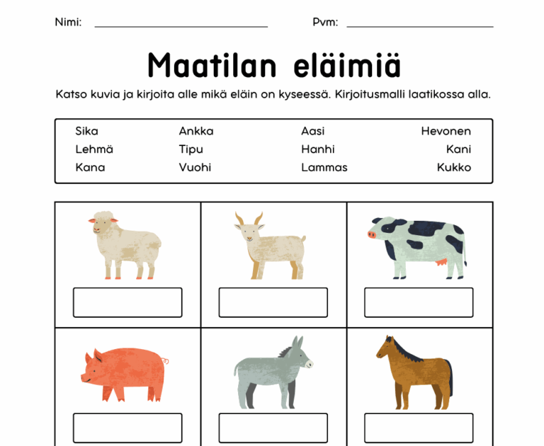 Hauska tehtävä lapsille: Maatilan eläimet kirjoitusharjoitus 🐷🦆🐴 Tervetuloa maatilalle! Tämä kahden sivun ”Maatilan eläimet kirjoitusharjoitus” vie lapsen tutustumaan tuttuihin maatilan eläimiin – sikoihin, ankkoihin, hevosiin, lampaisiin ja moneen muuhun. Jokaisen kuvan alle kirjoitetaan eläimen nimi: ensimmäisellä sivulla apuna on sanalaatikko, josta voi katsoa mallin, ja toisella sivulla nimet kirjoitetaan jo täysin omin voimin. Tehtävä tekee…