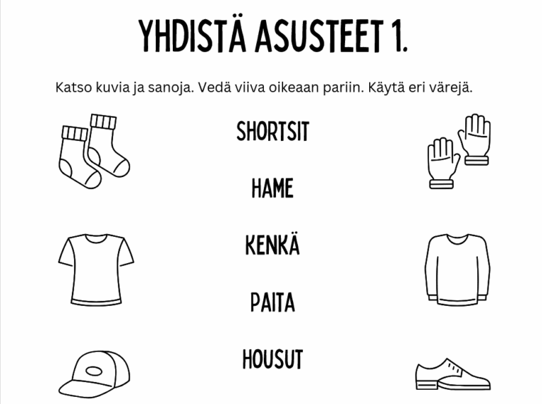 Yhdistä asusteet – hauska kieli- ja kuvatehtävä lapsille! Tämä nelisivuinen Yhdistä asusteet -tehtäväpaketti kutsuu lapset leikkimään sanoilla ja kuvilla samalla, kun he harjoittelevat tunnistamaan tuttuja vaatteita ja asusteita suomeksi ja englanniksi. Viivapiirroskuvat houkuttelevat värittämään ja antavat tilaa luovuudelle ja eriväristen viivojen käyttäminen tekee yhdistelyharjoituksesta entistä hauskemman. Kenelle tämä sopii? Alakouluikäisille lapsille, jotka harjoittelevat lukemista ja…