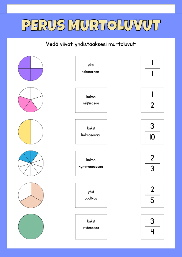 Murtoluvut ovat kuin palapelin paloja – ne kertovat, kuinka monta osaa kokonaisesta on kyseessä. Kun opit ymmärtämään murtoluvut, osaat paremmin jakaa, mitata ja ratkaista arkipäivän pulmia – aina reseptien puolittamisesta legorakennelmien jakamiseen. Pieni opetushetki: Murtoluku koostuu osoittajasta (ylärivi) ja nimittäjästä (alarivi). Osoittaja kertoo, montako osaa on otettu. Nimittäjä kertoo, kuinka moneen yhtä suureen osaan kokonaisuus…