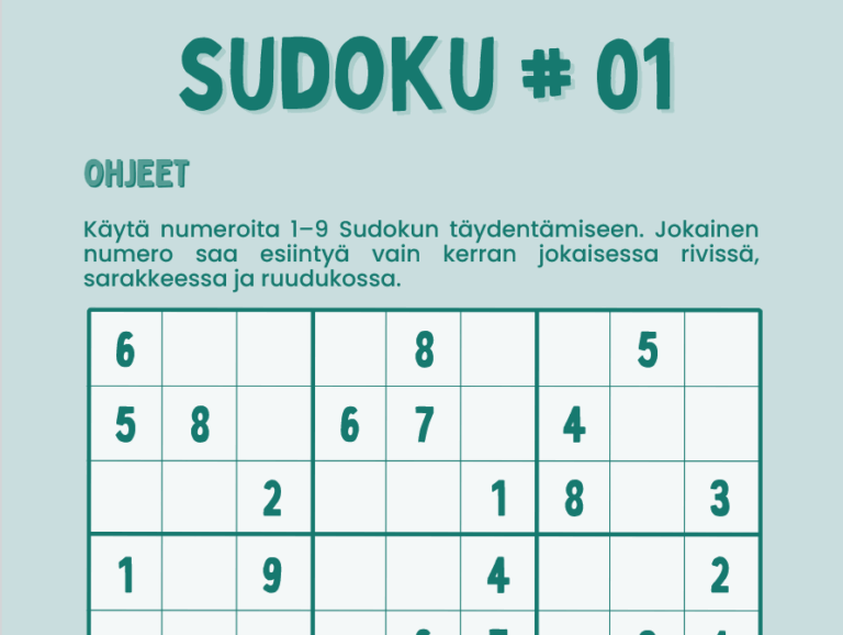Sudokut sopivat hyvin kotiopetuksen tueksi Sudoku on hauska ja monipuolinen pulmapeli, joka sopii erinomaisesti kotiopetukseen. Se tarjoaa sekä aivojumppaa että rauhallista keskittymistä vaativaa tekemistä. Tästä artikkelista voit ladata kaksi eritasoista sudokua tulostettavassa PDF-muodossa ja hyödyntää niitä osana lapsen oppimista. Mikä on sudoku? Sudoku on numeroruudukko, jossa tavoitteena on täyttää 9×9-ruudukko numeroilla 1–9 siten, että: Jokaisella…