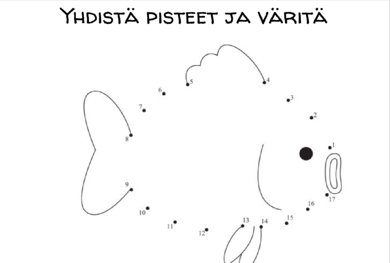 Piirrä pisteestä pisteeseen ja väritä! Tämä tulostettava ankka- ja kala-aiheinen tehtävä yhdistää hauskan tekemisen ja oppimisen. Tulosta tehtävä ja anna lapsen yhdistää pisteet numerojärjestyksessä. Lopuksi valmiit kuvat voi värittää, mikä lisää luovaa iloa! Tehtävä tarjoaa monia hyötyjä esikoululaiselle: Numerotuntemus: Pisteiden yhdistäminen numerojärjestyksessä auttaa lukujonon oppimisessa. Motoriset taidot: Viivojen piirtäminen kehittää kynän hallintaa ja tarkkuutta.…