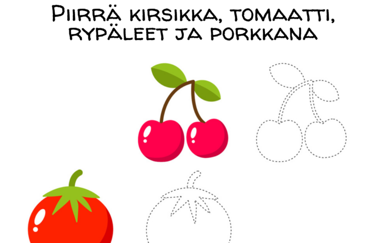 Piirrä ja väritä hedelmiä ja vihanneksia! Tulosta tämä kuva ja anna lapsen harjoitella piirtämistä seuraamalla katkoviivoja. Lopuksi kuvat voi värittää mallin mukaan tai omilla lempiväreillään! Tehtävä opettaa lasta piirtämään herkullisia kuvia, kuten kirsikan, porkkanan, viinirypäletertun ja tomaatin. Tämä tehtävä on paitsi hauska, myös kehittävä: Silmän ja käden yhteistyö: Katkoviivojen seuraaminen vahvistaa motorisia taitoja ja tarkkuutta.…