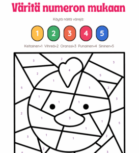 Väritä numeron mukaan – helppo 7 kuvan värityspaketti lapsille