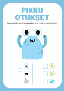 Lapsi laskee, montako kehonosaa hassuilla otuksilla on ja merkitsee vastaukset itse laatikoihin.
