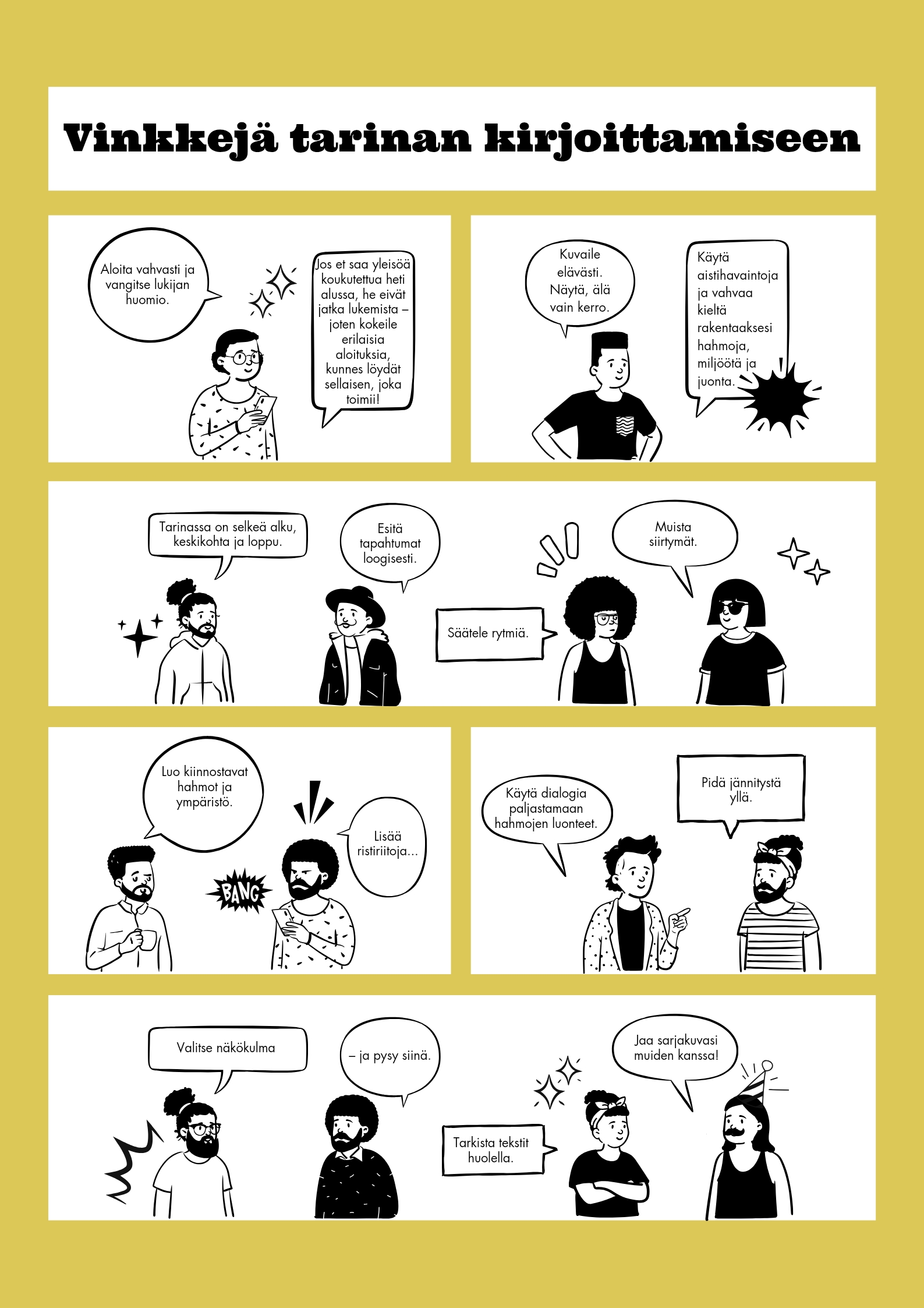 Artikkelin yhteydestä löydät tulostettavan sarjakuvan, jossa esitellään tarinankerronnan perussäännöt visuaalisesti. Voit laittaa sen vaikka seinälle muistutukseksi kirjoittamisesta!