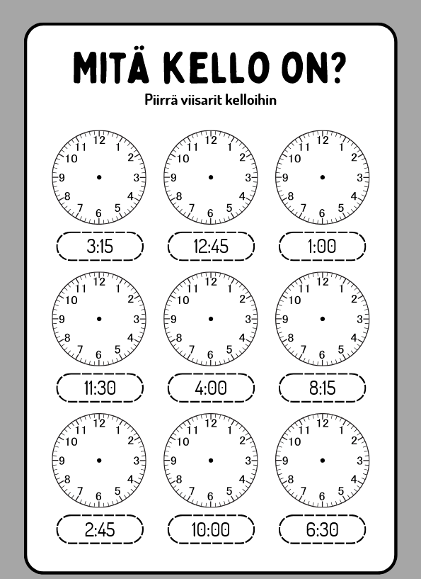 ✏️ Piirtämistehtäviä ja ajantulkintaa (tasan, yli, vaille, puoli)