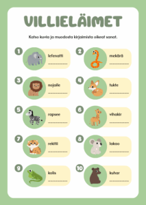 Villieläimet ja sekaisin menneet kirjaimet kirjoitustehtävä