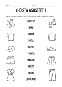 Tämä nelisivuinen Yhdistä asusteet -tehtäväpaketti kutsuu lapset leikkimään sanoilla ja kuvilla samalla, kun he harjoittelevat tunnistamaan tuttuja vaatteita ja asusteita suomeksi ja englanniksi. Viivapiirroskuvat houkuttelevat värittämään ja antavat tilaa luovuudelle ja eriväristen viivojen käyttäminen tekee yhdistelyharjoituksesta entistä hauskemman.